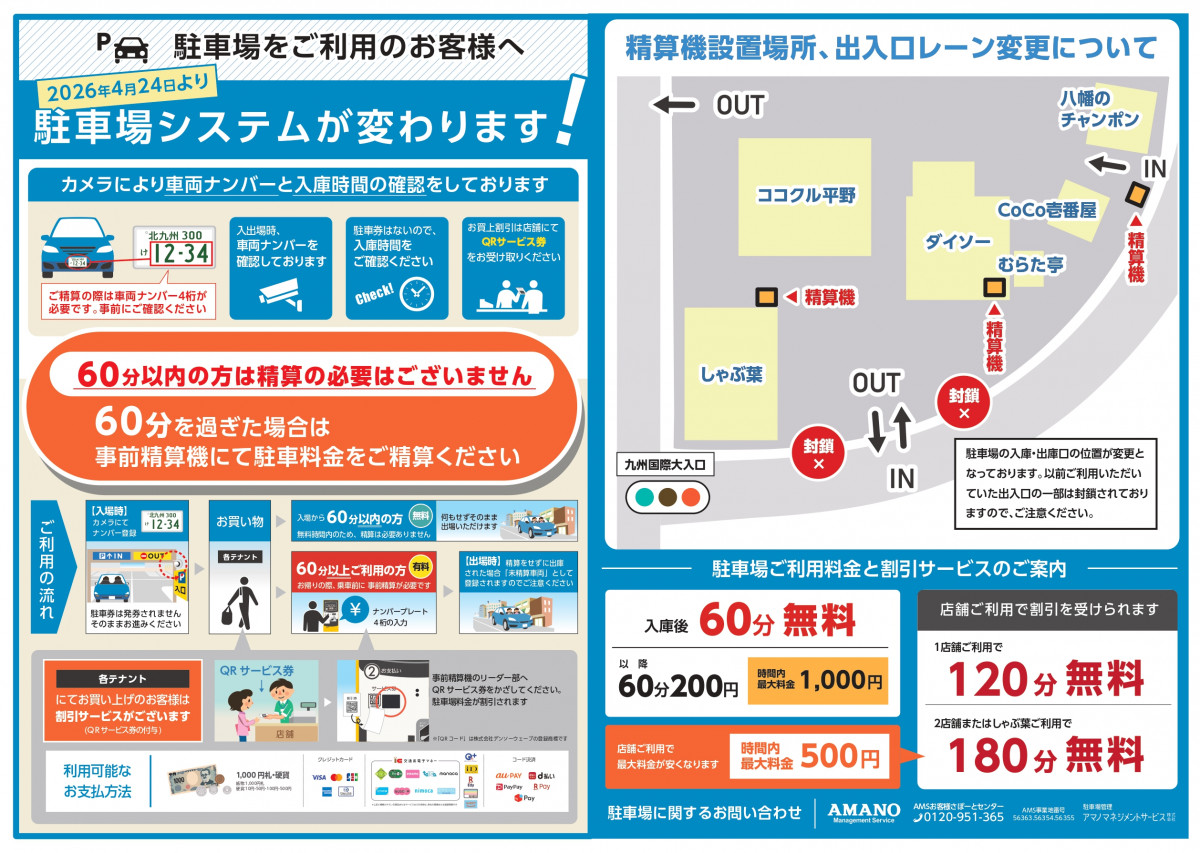 2026年4月24日より、商業施設「平野パーク」(北九州市八幡東区平野1丁目)において、駐車場システムを変更いたします。